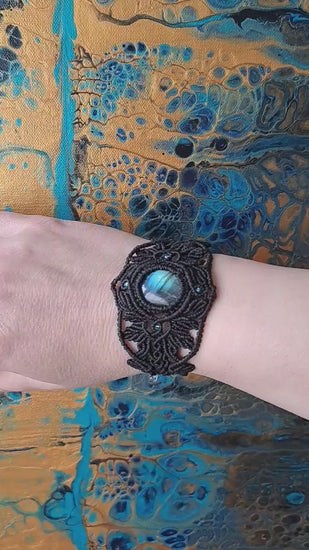 Bracelet en micro-macramé en fil Linhasita de 0.5mm avec une Labradorite de 25x18mm ton vert dominant, perles de rocailles métallisées et goutte de cristal. Taille ajustable
