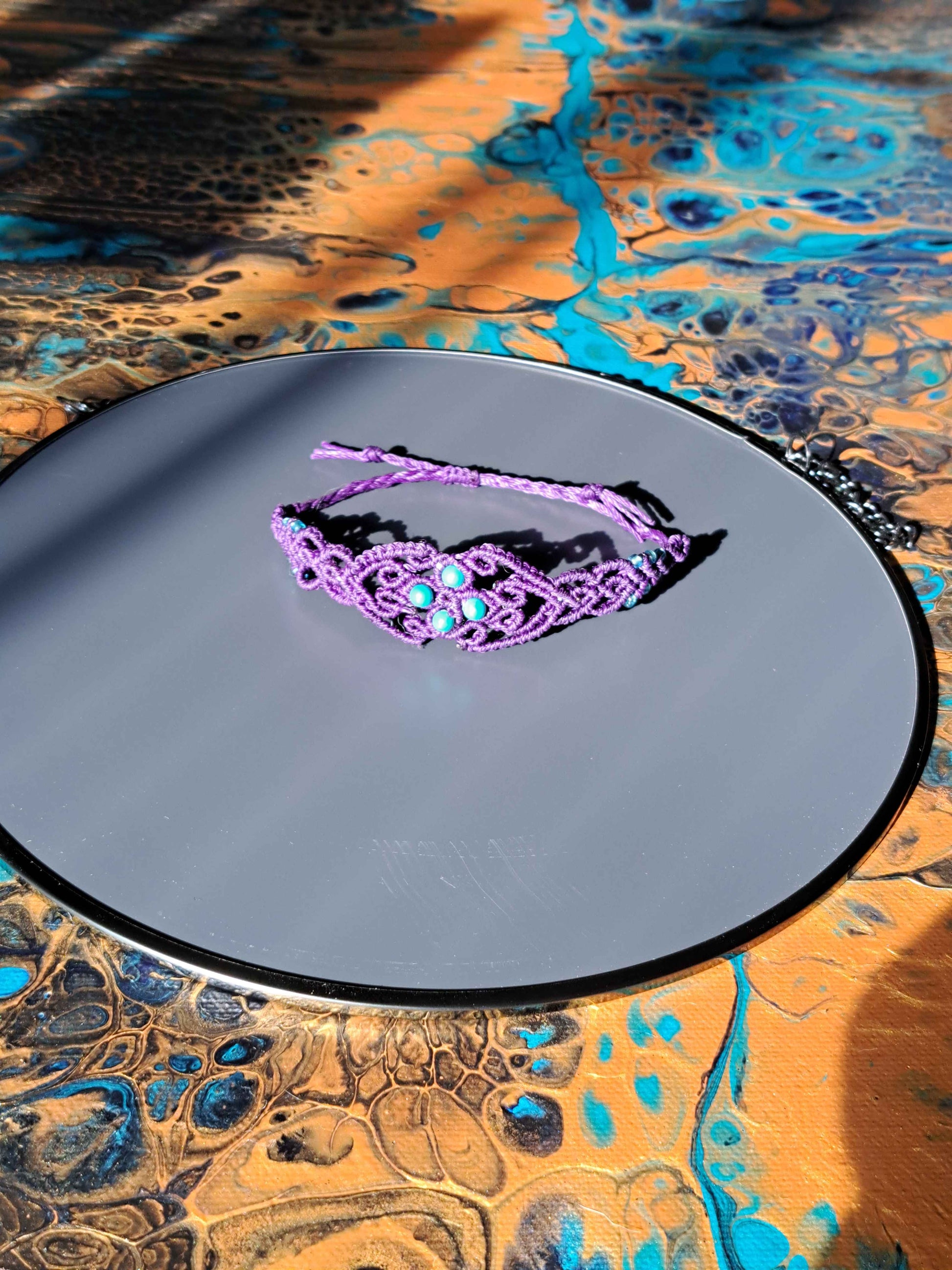Bracelet en micro-macramé en fil Linahsita de 0,75mm violet avec perles de turquoises et perles de rocaille. Taille ajustable