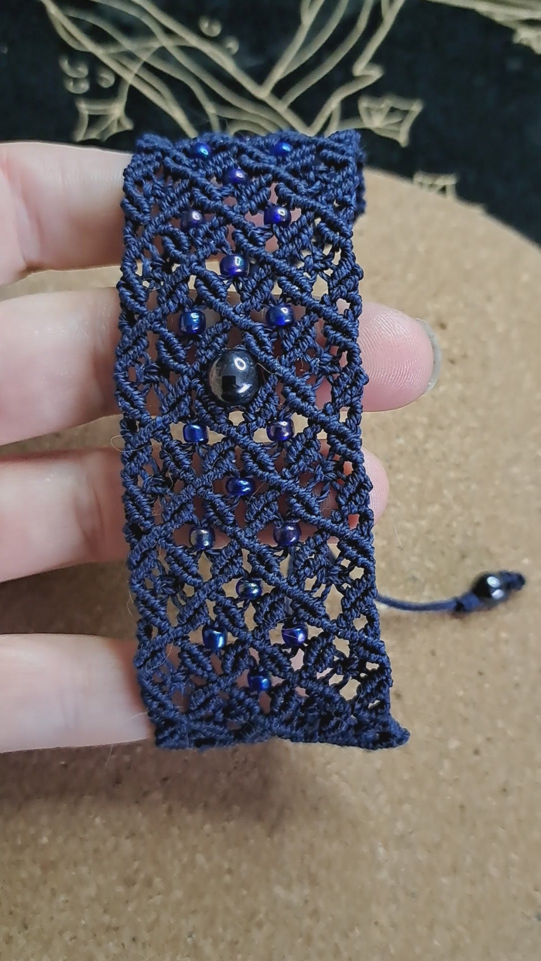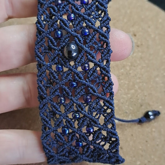 Bracelet en fil ciré Linasita bleu 0.75mm avec une perle d'hématite de 0.8cm et 2 autres de 0,4cm et des perles de rocaille irisées. Largeur de 4 cm environ. Taille ajustable