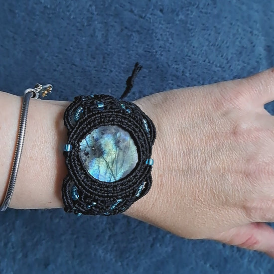 Bracelet micro-macramé en fil ciré Linahsita de 0.75cm noir, labradorite plate ronde de 4cm et perles de rocaille.
