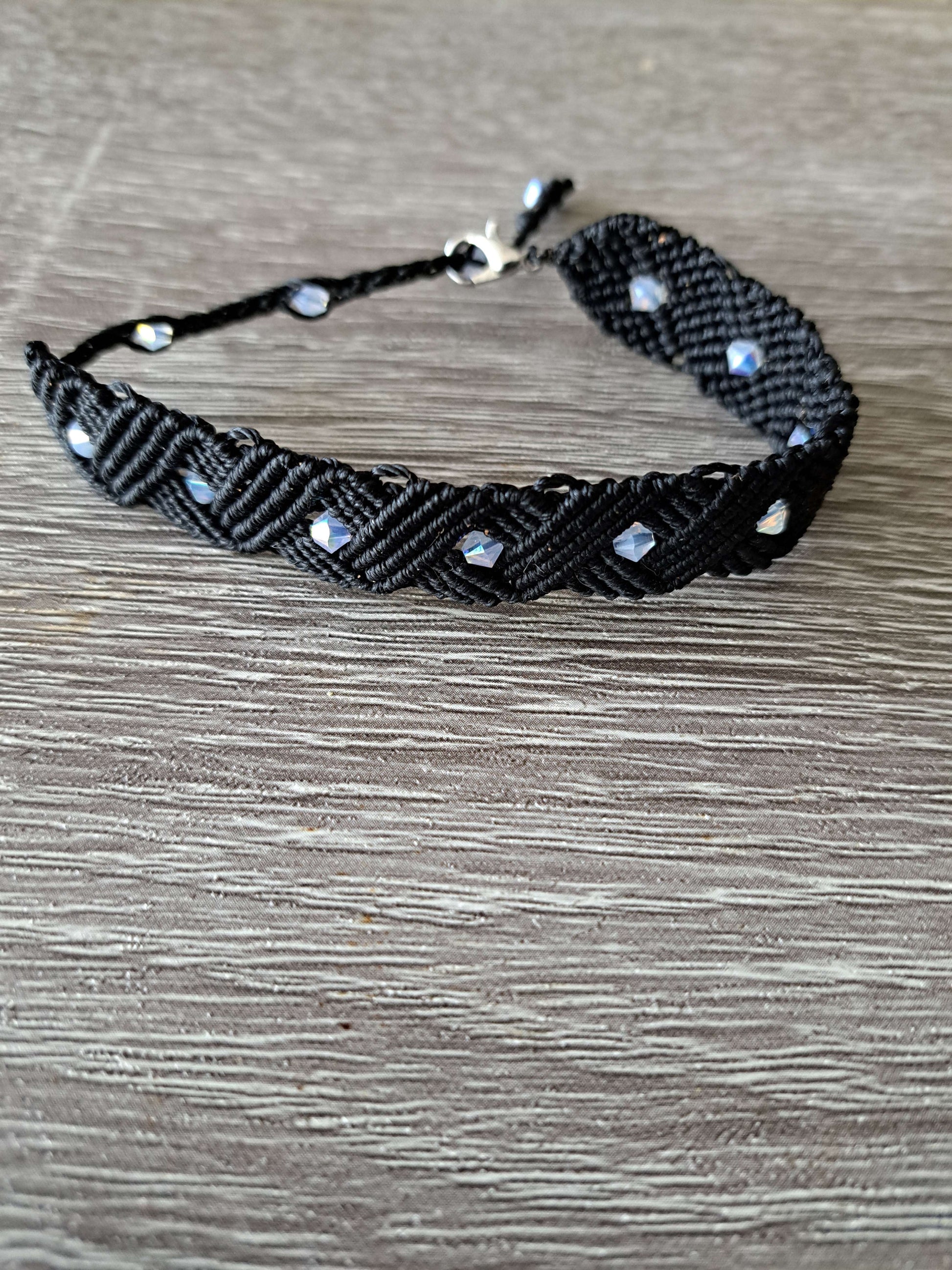 Bracelet en micro-macramé avec du fil ciré Linhasita noir de 0,5mm et toupies de cristal "White Opal AB" de 4mm. Taille ajustable avec fermoir.