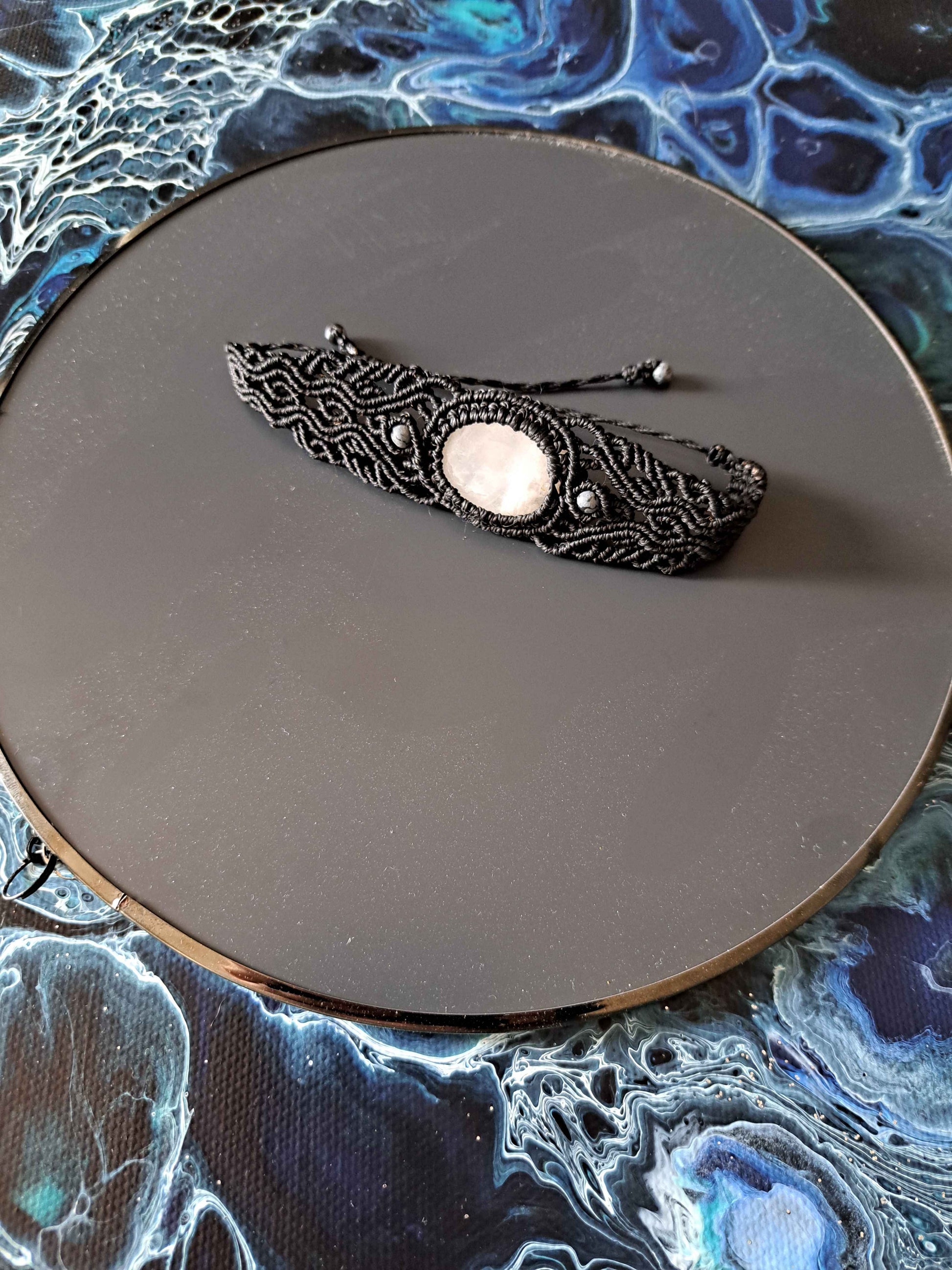 Bracelet en micro-macramé en fil noir Linhasita de 0.75mm, une pierre de lune de 3x2.5 cm et 4 perles d'obsidienne mouchetée. Taille ajustable