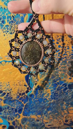 Collier réalisé avec du fil ciré Linhasita de 0,5mm noir et fil métallique cuivré de 0,3mm, Labradorite ronde de 4 cm et 12 perles de 6mm en Labradorite. Tour de cou de 60cm avec fermoir.