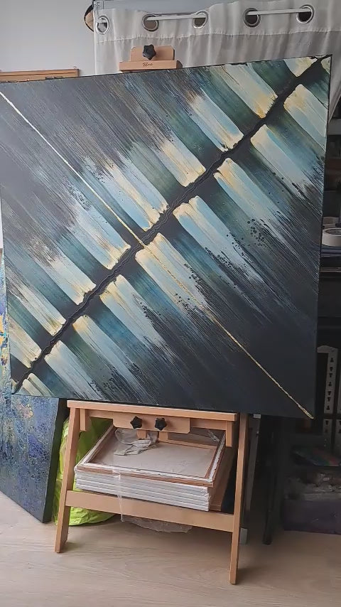 Peinture acrylique métallique et iridescente et feuilles d'or sur châssis entoilé 3D de 100x100cm. Travail énergétique sur l'ancrage et le réalignement ainsi que sur la colonne vertébrale.